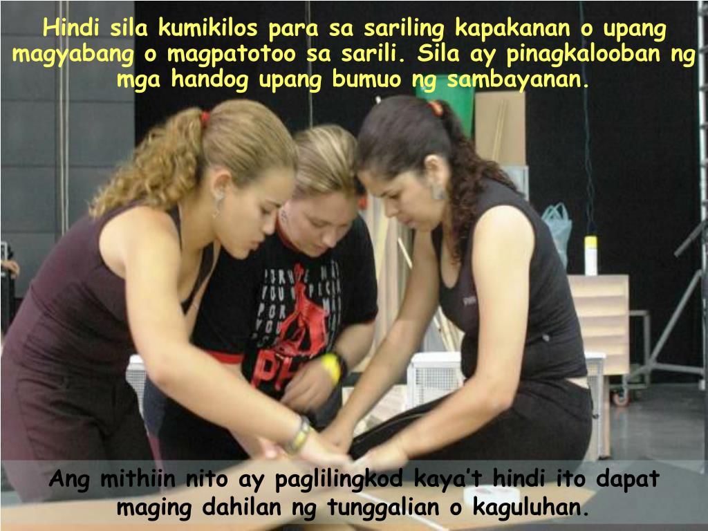 Hindi sila kumikilos para sa sariling kapakanan o upang magyabang o magpatotoo sa sarili. Sila ay pinagkalooban ng mga handog upang bumuo ng sambayanan. Ang mithiin nito ay paglilingkod kaya’t hindi ito dapat maging dahilan ng tunggalian o kaguluhan.