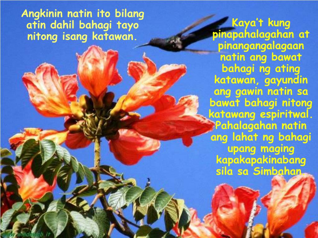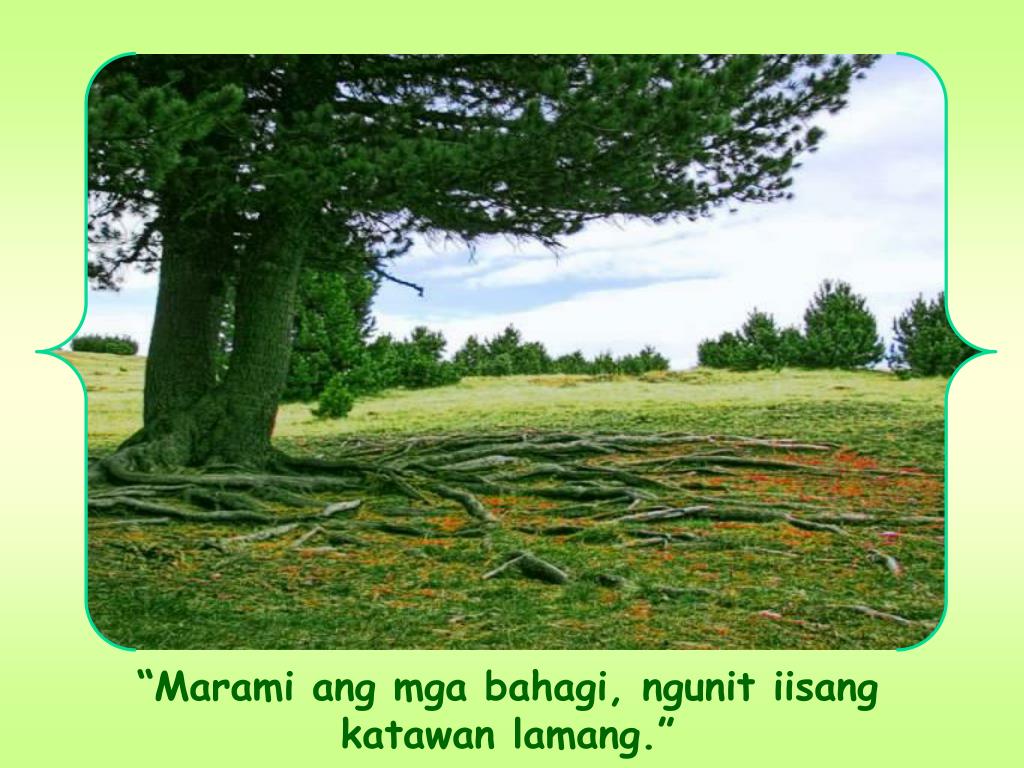 Kaya’t kung pinapahalagahan at pinangangalagaan natin ang bawat bahagi ng ating katawan, gayundin ang gawin natin sa bawat bahagi nitong katawang espiritwal. Pahalagahan natin ang lahat ng bahagi upang maging kapakapakinabang sila sa Simbahan. Angkinin natin ito bilang atin dahil bahagi tayo nitong isang katawan.