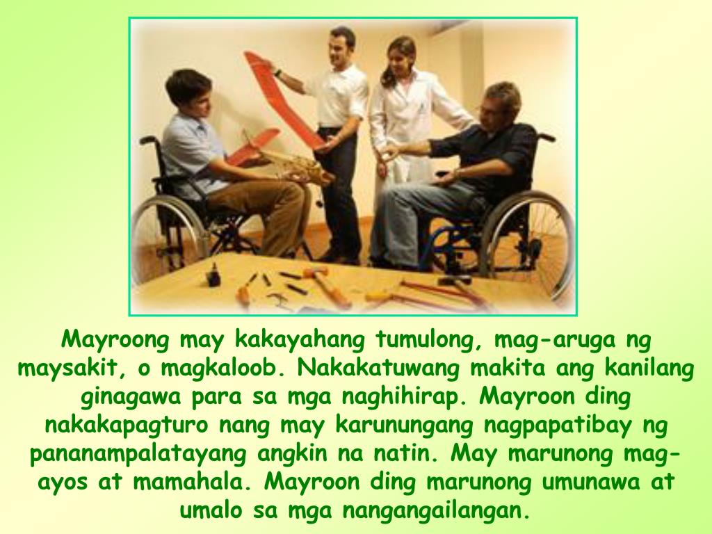 Mayroong may kakayahang tumulong, mag-aruga ng maysakit, o magkaloob. Nakakatuwang makita ang kanilang ginagawa para sa mga naghihirap. Mayroon ding nakakapagturo nang may karunungang nagpapatibay ng pananampalatayang angkin na natin. May marunong mag-ayos at mamahala. Mayroon ding marunong umunawa at umalo sa mga nangangailangan.