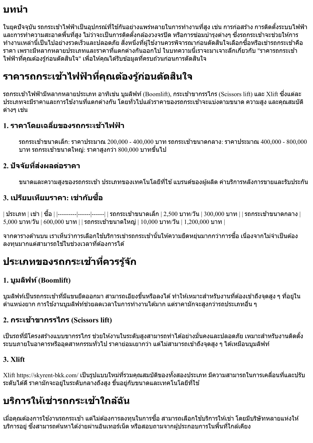บทนํา ในยุคปัจจุบันรถกระเช้าไฟฟ้าเป็นอุปกรณ์ที?ใช้กันอย่างแพร่หลายในการทํางานที?สูงเช่นการก่อสร้างการติดตั?งระบบไฟฟ้า และการทําความสะอาดพื?นที?สูงไม่ว่าจะเป็นการติดตั?งกล้องวงจรปิดหรือการซ่อมบํารุงต่างๆซึ?งรถกระเช้าจะช่วยให้การ ทํางานเหล่านี?เป็นไปอย่างรวดเร็วและปลอดภัยสิ?งหนึ?งที?ผู้ใช้งานควรพิจารณาก่อนตัดสินใจเลือกซื?อหรือเช่ารถกระเช้าคือ ราคาเพราะมีหลากหลายประเภทและราคาที?แตกต่างกันออกไปในบทความนี?เราจะมาเจาะลึกเกี?ยวกับ "ราคารถกระเช้า ไฟฟ้าที?คุณต้องรู้ก่อนตัดสินใจ" เพื?อให้คุณได้รับข้อมูลที?ครบถ้วนก่อนการตัดสินใจ ราคารถกระเช้าไฟฟ ้ าที?คุณต้องรู้ก่อนตัดสินใจ รถกระเช้าไฟฟ้ามีหลากหลายประเภทอาทิเช่นบูมลิฟท์ (Boomlift), กระเช้าขากรรไกร (Scissors lift) และ Xlift ซึ?งแต่ละ ประเภทจะมีราคาและการใช้งานที?แตกต่างกันโดยทั?วไปแล้วราคาของรถกระเช้าจะแบ่งตามขนาดความสูงและคุณสมบัติ ต่างๆเช่น 1. ราคาโดยเฉลี?ยของรถกระเช้าไฟฟ ้ า รถกระเช้าขนาดเล็ก: ราคาประมาณ 200,000 - 400,000 บาทรถกระเช้าขนาดกลาง: ราคาประมาณ 400,000 - 800,000 บาทรถกระเช้าขนาดใหญ่: ราคาสูงกว่า 800,000 บาทขึ?นไป 2. ปัจจัยที?ส่งผลต่อราคา ขนาดและความสูงของรถกระเช้าประเภทของเทคโนโลยีที?ใช้แบรนด์ของผู้ผลิตค่าบริการหลังการขายและรับประกัน 3. เปรียบเทียบราคา: เช่ากับซื?อ | ประเภท | เช่า | ซื?อ | |---------|------|------| | รถกระเช้าขนาดเล็ก | 2,500 บาท/วัน | 300,000 บาท | | รถกระเช้าขนาดกลาง | 5,000 บาท/วัน | 600,000 บาท | | รถกระเช้าขนาดใหญ่ | 10,000 บาท/วัน | 1,200,000 บาท | จากตารางด้านบนเราเห็นว่าการเลือกใช้บริการเช่ารถกระเช้านั?นให้ความยืดหยุ่นมากกว่าการซื?อเนื?องจากไม่จําเป็นต้อง ลงทุนมากแต่สามารถใช้ในช่วงเวลาที?ต้องการได้ ประเภทของรถกระเช้าที?ควรรู้จัก 1. บูมลิฟท์ (Boomlift) บูมลิฟท์เป็นรถกระเช้าที?มีแขนยืดออกมาสามารถเอียงขึ?นหรือลงได้ทําให้เหมาะสําหรับงานที?ต้องเข้าถึงจุดสูงๆที?อยู่ใน ตําแหน่งยากการใช้งานบูมลิฟท์ช่วยลดเวลาในการทํางานได้มากแต่ราคามักจะสูงกว่ารถประเภทอื?นๆ 2. กระเช้าขากรรไกร (Scissors lift) เป็นรถที?มีโครงสร้างแบบขากรรไกรช่วยให้งานในระดับสูงสามารถทําได้อย่างมั?นคงและปลอดภัยเหมาะสําหรับงานติดตั?ง ระบบภายในอาคารหรืออุตสาหกรรมทั?วไปราคาย่อมเยากว่าแต่ไม่สามารถเข้าถึงจุดสูงๆได้เหมือนบูมลิฟท์ 3. Xlift Xlift https://skyrent-bkk.com/ เป็นรูปแบบใหม่ที?รวมคุณสมบัติของทั?งสองประเภทมีความสามารถในการเคลื?อนที?และปรับ ระดับได้ดีราคามักจะอยู่ในระดับกลางถึงสูงขึ?นอยู่กับขนาดและเทคโนโลยีที?ใช้ บริการให้เช่ารถกระเช้าใกล้ฉัน เมื?อคุณต้องการใช้งานรถกระเช้าแต่ไม่ต