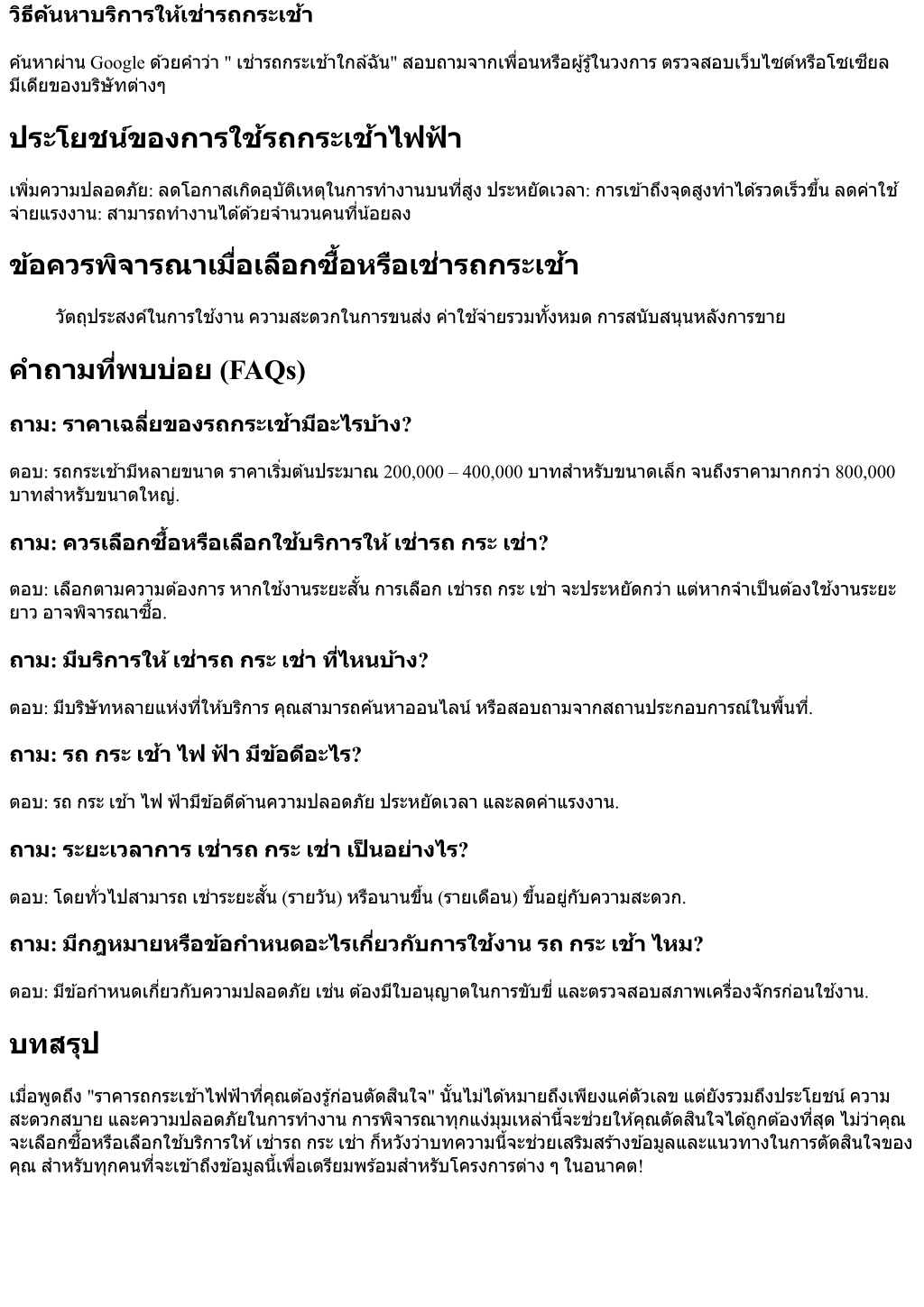 วิธีค้นหาบริการให้เช่ารถกระเช้าวิธีค้นหาบริการให้เช่ารถกระเช้า ค้นหาผ่าน Google ด้วยคําว่า " เช่ารถกระเช้าใกล้ฉัน" สอบถามจากเพื?อนหรือผู้รู้ในวงการตรวจสอบเว็บไซต์หรือโซเซียล มีเดียของบริษัทต่างๆ ประโยชน์ของการใช้รถกระเช้าไฟฟ ้ า เพิ?มความปลอดภัย: ลดโอกาสเกิดอุบัติเหตุในการทํางานบนที?สูงประหยัดเวลา: การเข้าถึงจุดสูงทําได้รวดเร็วขึ?นลดค่าใช้ จ่ายแรงงาน: สามารถทํางานได้ด้วยจํานวนคนที?น้อยลง ข้อควรพิจารณาเมื?อเลือกซื?อหรือเช่ารถกระเช้า วัตถุประสงค์ในการใช้งานความสะดวกในการขนส่งค่าใช้จ่ายรวมทั?งหมดการสนับสนุนหลังการขาย คําถามที?พบบ่อย (FAQs) ถาม: ราคาเฉลี?ยของรถกระเช้ามีอะไรบ้าง? ตอบ: รถกระเช้ามีหลายขนาดราคาเริ?มต้นประมาณ 200,000 – 400,000 บาทสําหรับขนาดเล็กจนถึงราคามากกว่า 800,000 บาทสําหรับขนาดใหญ่. ถาม: ควรเลือกซื?อหรือเลือกใช้บริการให้เช่ารถกระเช่า? ตอบ: เลือกตามความต้องการหากใช้งานระยะสั?นการเลือกเช่ารถกระเช่าจะประหยัดกว่าแต่หากจําเป็นต้องใช้งานระยะ ยาวอาจพิจารณาซื?อ. ถาม: มีบริการให้เช่ารถกระเช่าที?ไหนบ้าง? ตอบ: มีบริษัทหลายแห่งที?ให้บริการคุณสามารถค้นหาออนไลน์หรือสอบถามจากสถานประกอบการณ์ในพื?นที?. ถาม: รถกระเช้าไฟฟ ้ ามีข้อดีอะไร? ตอบ: รถกระเช้าไฟฟ้ามีข้อดีด้านความปลอดภัยประหยัดเวลาและลดค่าแรงงาน. ถาม: ระยะเวลาการเช่ารถกระเช่าเป ็ นอย่างไร? ตอบ: โดยทั?วไปสามารถเช่าระยะสั?น (รายวัน) หรือนานขึ?น (รายเดือน) ขึ?นอยู่กับความสะดวก. ถาม: มีกฎหมายหรือข้อกําหนดอะไรเกี?ยวกับการใช้งานรถกระเช้าไหม? ตอบ: มีข้อกําหนดเกี?ยวกับความปลอดภัยเช่นต้องมีใบอนุญาตในการขับขี?และตรวจสอบสภาพเครื?องจักรก่อนใช้งาน. บทสรุป เมื?อพูดถึง "ราคารถกระเช้าไฟฟ้าที?คุณต้องรู้ก่อนตัดสินใจ" นั?นไม่ได้หมายถึงเพียงแค่ตัวเลขแต่ยังรวมถึงประโยชน์ความ สะดวกสบายและความปลอดภัยในการทํางานการพิจารณาทุกแง่มุมเหล่านี?จะช่วยให้คุณตัดสินใจได้ถูกต้องที?สุดไม่ว่าคุณ จะเลือกซื?อหรือเลือกใช้บริการให้เช่ารถกระเช่าก็หวังว่าบทความนี?จะช่วยเสริมสร้างข้อมูลและแนวทางในการตัดสินใจของ คุณสําหรับทุกคนที?จะเข้าถึงข้อมูลนี?เพื?อเตรียมพร้อมสําหรับโครงการต่างๆในอนาคต!