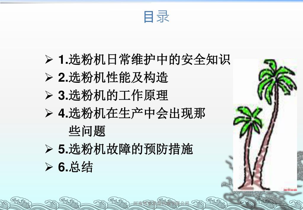 目录 • 1.选粉机日常维护中的安全知识 • 2.选粉机性能及构造 • 3.选粉机的工作原理 • 4.选粉机在生产中会出现那 • 些问题 • 5.选粉机故障的预防措施 • 6.总结 河南恒安重型机械有限公司