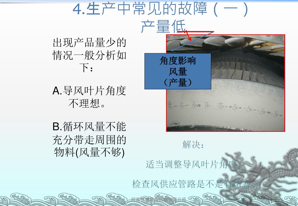 4.生产中常见的故障(一) 产量低 出现产品量少的情况一般分析如下: A.导风叶片角度不理想。 B.循环风量不能充分带走周围的物料(风量不够) 角度影响风量(产量) 解决: 适当调整导风叶片角度。 检查风供应管路是不是有堵塞。 河南恒安重型机械有限公司