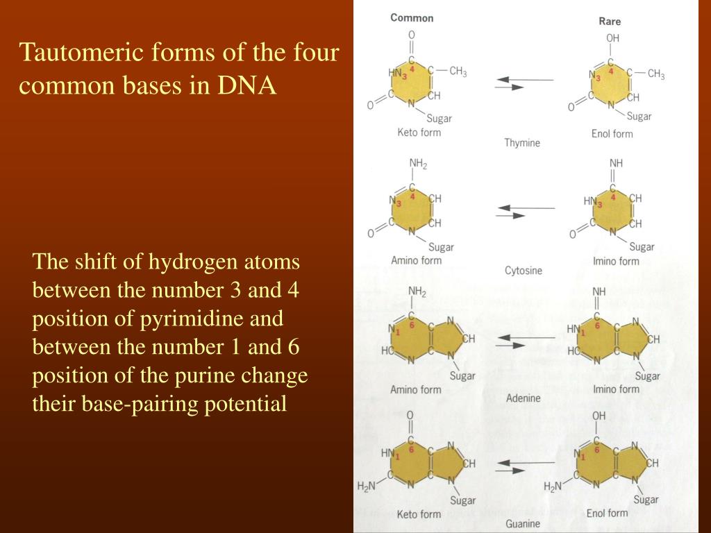 Tautomeric forms of the four common bases in DNA The shift of hydrogen atoms between the number 3 and 4 position of pyrimidine and between the number 1 and 6 position of the purine change their base-pairing potential