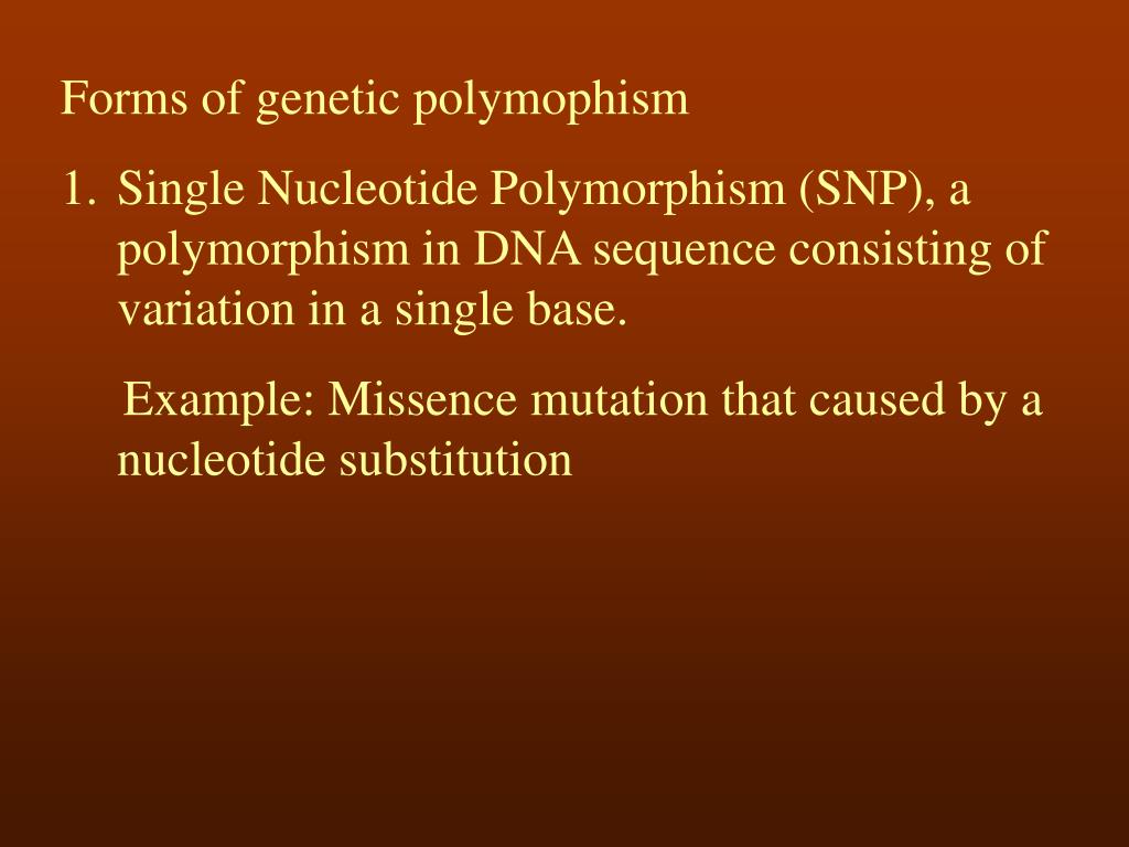 Forms of genetic polymophism • Single Nucleotide Polymorphism (SNP), a polymorphism in DNA sequence consisting of variation in a single base. • Example: Missence mutation that caused by a nucleotide substitution