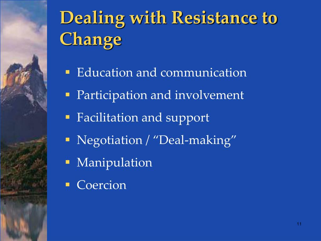 Dealing with Resistance to Change • Education and communication • Participation and involvement • Facilitation and support • Negotiation / “Deal-making” • Manipulation • Coercion
