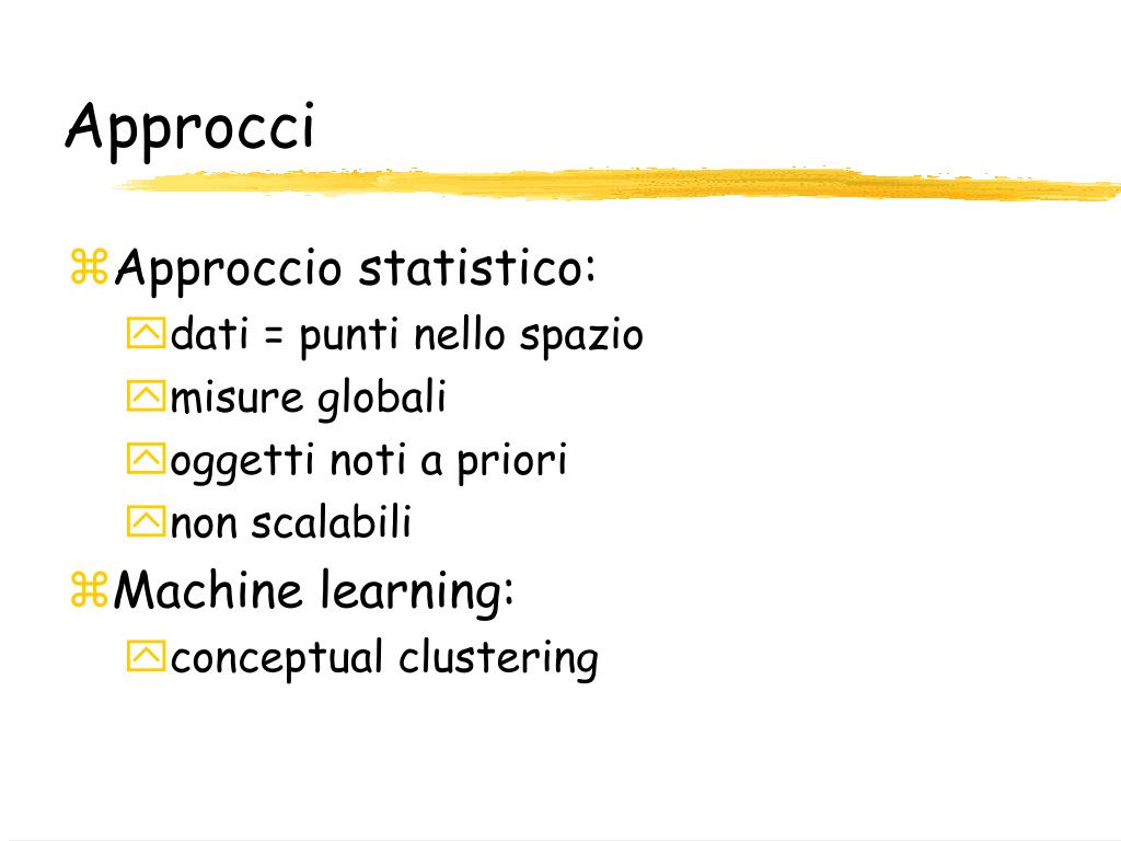 Approcci • Approccio statistico: • dati = punti nello spazio • misure globali • oggetti noti a priori • non scalabili • Machine learning: • conceptual clustering