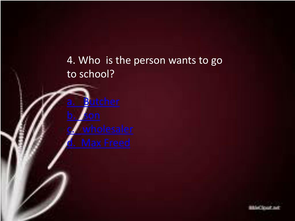 4. Who is the person wants to go to school? a. Butcher b. son c. wholesaler d. Max Freed