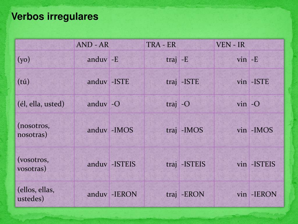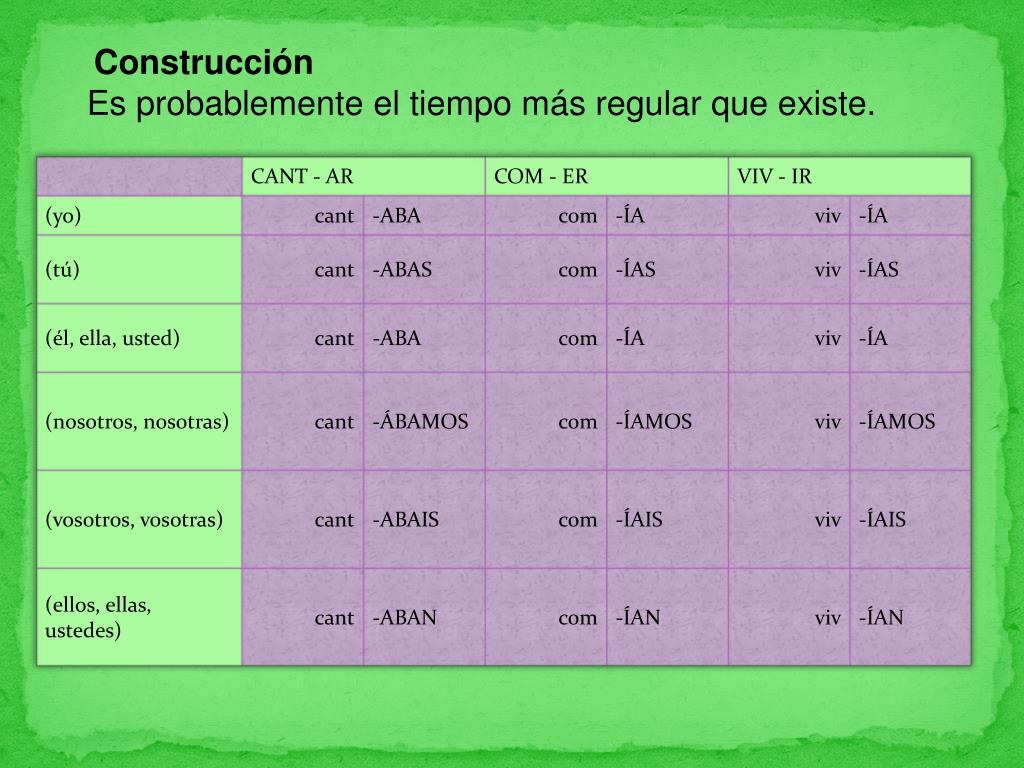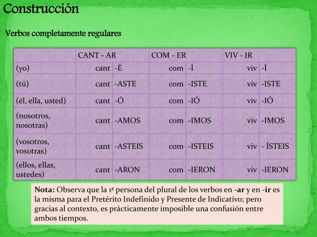 Construcción Verbos completamente regulares Nota: Observa que la 1ª persona del plural de los verbos en -ar y en -ir es la misma para el Pretérito Indefinido y Presente de Indicativo; pero gracias al contexto, es prácticamente imposible una confusión entre ambos tiempos.
