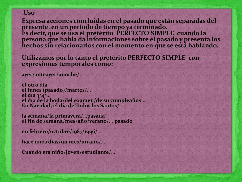 Uso • Expresa acciones concluidas en el pasado que están separadas del presente, en un período de tiempo ya terminado.Es decir, que se usa el pretérito PERFECTO SIMPLE cuando la persona que habla da informaciones sobre el pasado y presenta los hechos sin relacionarlos con el momento en que se está hablando. Utilizamos por lo tanto el pretérito PERFECTO SIMPLE con expresiones temporales como: ayer/anteayer/anoche/... el otro díael lunes (pasado)/martes/...el día 3/4/...el día de la boda/del examen/de su cumpleaños ... En Navidad, el día de Todos los Santos/...la semana/la primavera/...pasadael fin de semana/mes/año/verano/... pasadoen febrero/octubre/1987/1996/...hace unos días/un mes/un año/...Cuando era niño/joven/estudiante/...