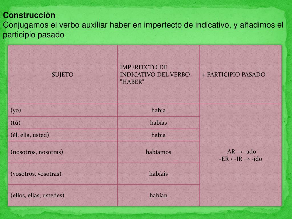Construcción Conjugamos el verbo auxiliar haber en imperfecto de indicativo, y añadimos el participio pasado: