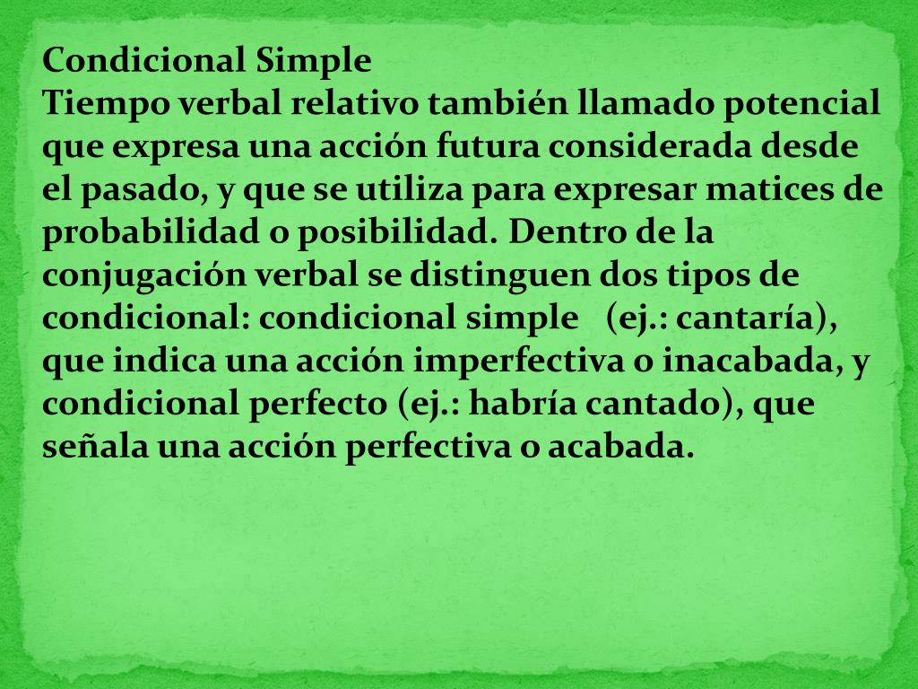Condicional Simple Tiempo verbal relativo también llamado potencial que expresa una acción futura considerada desde el pasado, y que se utiliza para expresar matices de probabilidad o posibilidad. Dentro de la conjugación verbal se distinguen dos tipos de condicional: condicional simple (ej.: cantaría), que indica una acción imperfectiva o inacabada, y condicional perfecto (ej.: habría cantado), que señala una acción perfectiva o acabada.