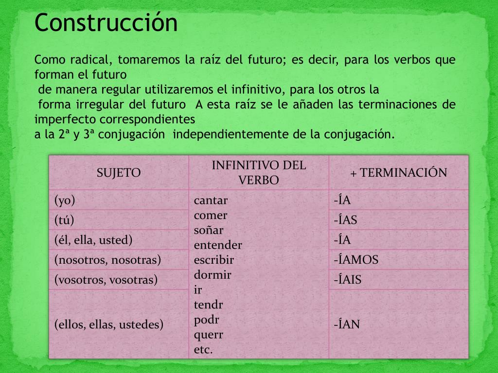 Construcción Como radical, tomaremos la raíz del futuro; es decir, para los verbos que forman el futuro de manera regular utilizaremos el infinitivo, para los otros la forma irregular del futuro A esta raíz se le añaden las terminaciones de imperfecto correspondientes a la 2ª y 3ª conjugación independientemente de la conjugación.