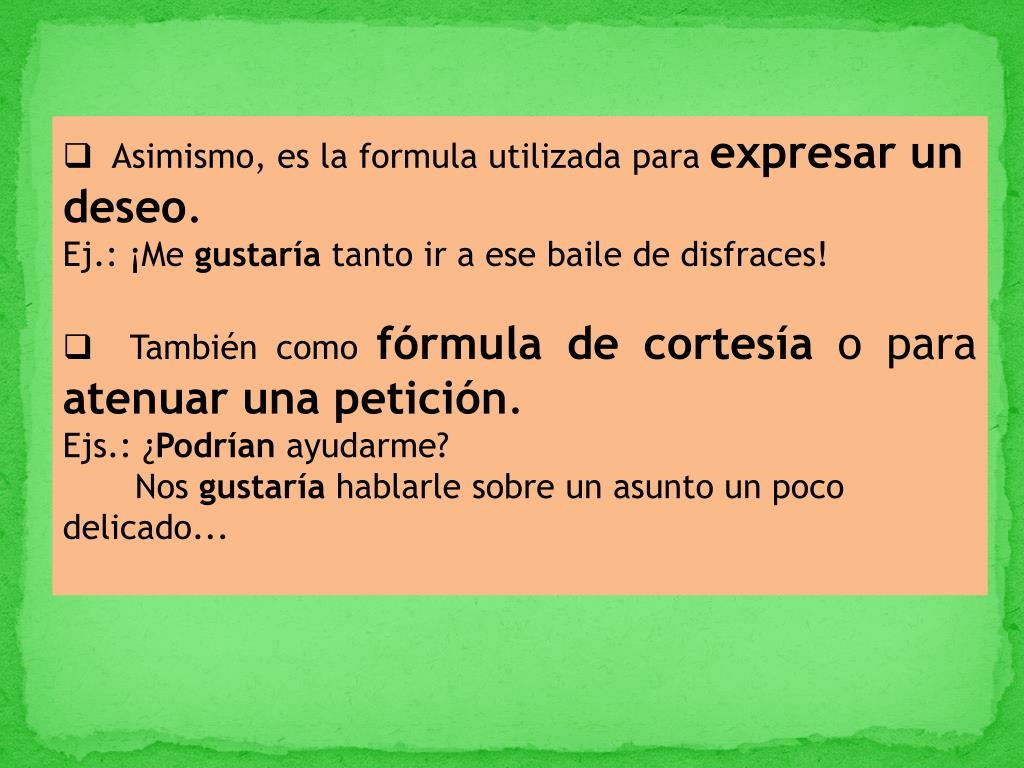 Asimismo, es la formula utilizada para expresar un deseo. • Ej.: ¡Me gustaría tanto ir a ese baile de disfraces! • También como fórmula de cortesía o para atenuar una petición. • Ejs.: ¿Podrían ayudarme? Nos gustaría hablarle sobre un asunto un poco delicado...