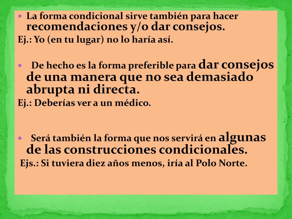 La forma condicional sirve también para hacer recomendaciones y/o dar consejos. Ej.: Yo (en tu lugar) no lo haría así. • De hecho es la forma preferible para dar consejos de una manera que no sea demasiado abrupta ni directa. Ej.: Deberías ver a un médico. • Será también la forma que nos servirá en algunas de las construcciones condicionales. Ejs.: Si tuviera diez años menos, iría al Polo Norte.