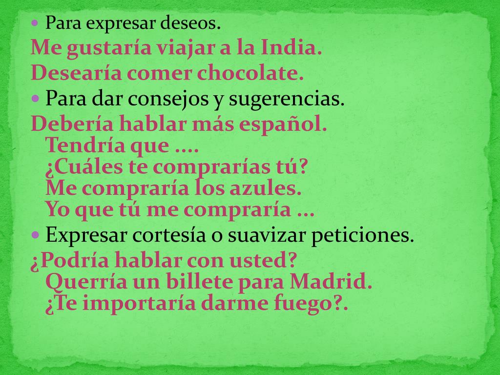 Para expresar deseos. Me gustaría viajar a la India. Desearía comer chocolate. • Para dar consejos y sugerencias. Debería hablar más español.Tendría que ....¿Cuáles te comprarías tú?Me compraría los azules.Yo que tú me compraría ... • Expresar cortesía o suavizar peticiones. ¿Podría hablar con usted?Querría un billete para Madrid.¿Te importaría darme fuego?.