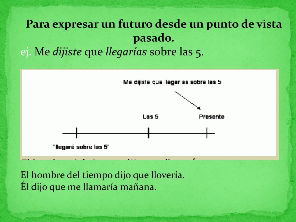 Para expresar un futuro desde un punto de vista pasado. ej. Me dijiste que llegarías sobre las 5. El hombre del tiempo dijo que llovería.Él dijo que me llamaría mañana.