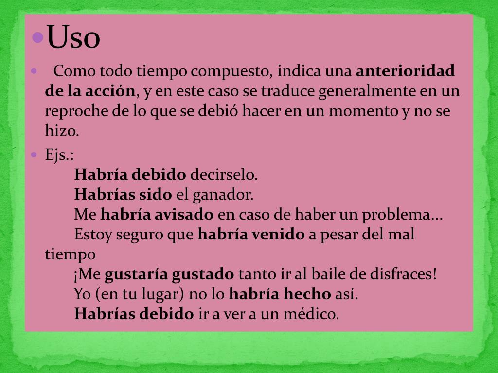 Uso • Como todo tiempo compuesto, indica una anterioridad de la acción, y en este caso se traduce generalmente en un reproche de lo que se debió hacer en un momento y no se hizo. • Ejs.:Habría debidodecirselo. Habrías sido el ganador. Me habría avisado en caso de haber un problema... Estoy seguro que habría venido a pesar del mal tiempo ¡Me gustaría gustado tanto ir al baile de disfraces! Yo (en tu lugar) no lo habría hecho así. Habrías debido ir a ver a un médico.