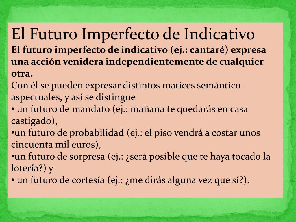 El Futuro Imperfecto de Indicativo • El futuro imperfecto de indicativo (ej.: cantaré) expresa una acción venidera independientemente de cualquier otra. • Con él se pueden expresar distintos matices semántico-aspectuales, y así se distingue • un futuro de mandato (ej.: mañana te quedarás en casa castigado), • un futuro de probabilidad (ej.: el piso vendrá a costar unos cincuenta mil euros), • un futuro de sorpresa (ej.: ¿será posible que te haya tocado la lotería?) y • un futuro de cortesía (ej.: ¿me dirás alguna vez que sí?).
