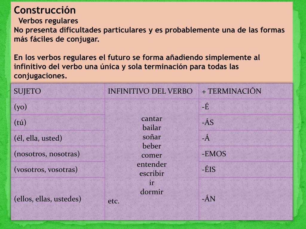 Construcción Verbos regulares No presenta dificultades particulares y es probablemente una de las formas más fáciles de conjugar. En los verbos regulares el futuro se forma añadiendo simplemente al infinitivo del verbo una única y sola terminación para todas las conjugaciones.
