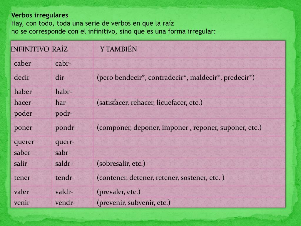 Verbos irregulares Hay, con todo, toda una serie de verbos en que la raíz no se corresponde con el infinitivo, sino que es una forma irregular: