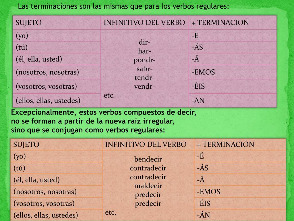 Las terminaciones son las mismas que para los verbos regulares: Excepcionalmente, estos verbos compuestos de decir, no se forman a partir de la nueva raíz irregular, sino que se conjugan como verbos regulares: