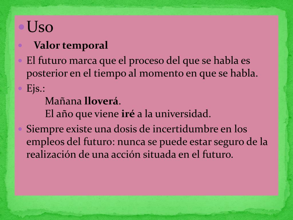 Uso • Valor temporal • El futuro marca que el proceso del que se habla es posterior en el tiempo al momento en que se habla. • Ejs.: Mañana lloverá. El año que viene iré a la universidad. • Siempre existe una dosis de incertidumbre en los empleos del futuro: nunca se puede estar seguro de la realización de una acción situada en el futuro.