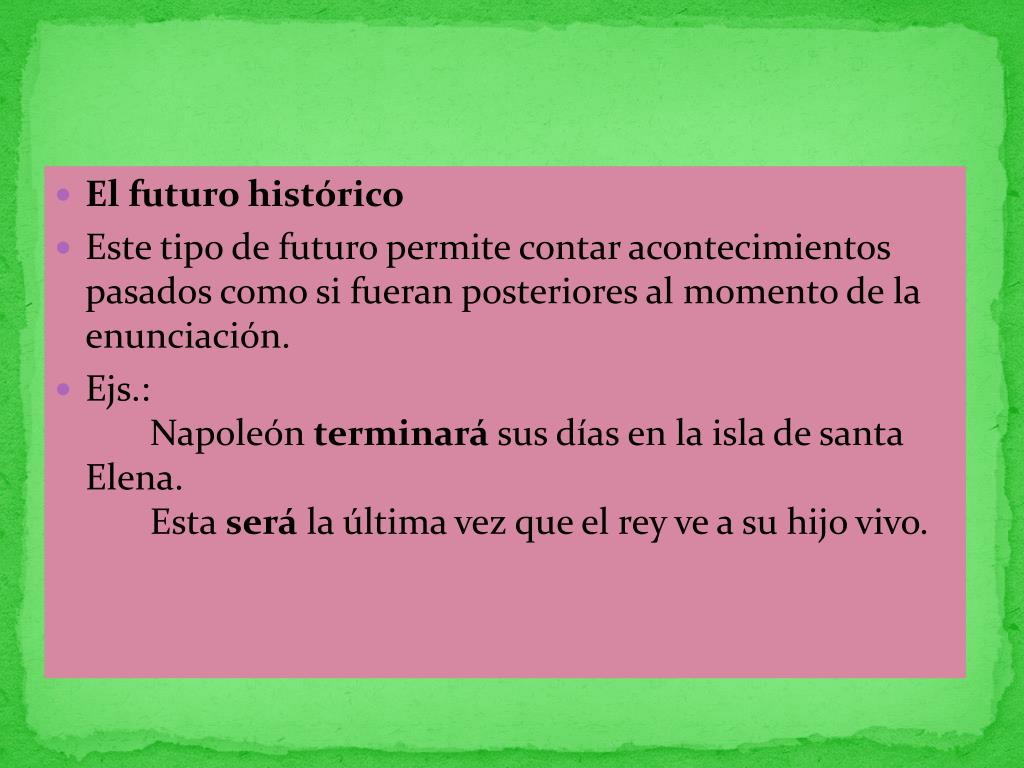 El futuro histórico • Este tipo de futuro permite contar acontecimientos pasados como si fueran posteriores al momento de la enunciación. • Ejs.: Napoleón terminará sus días en la isla de santa Elena. Esta será la última vez que el rey ve a su hijo vivo.