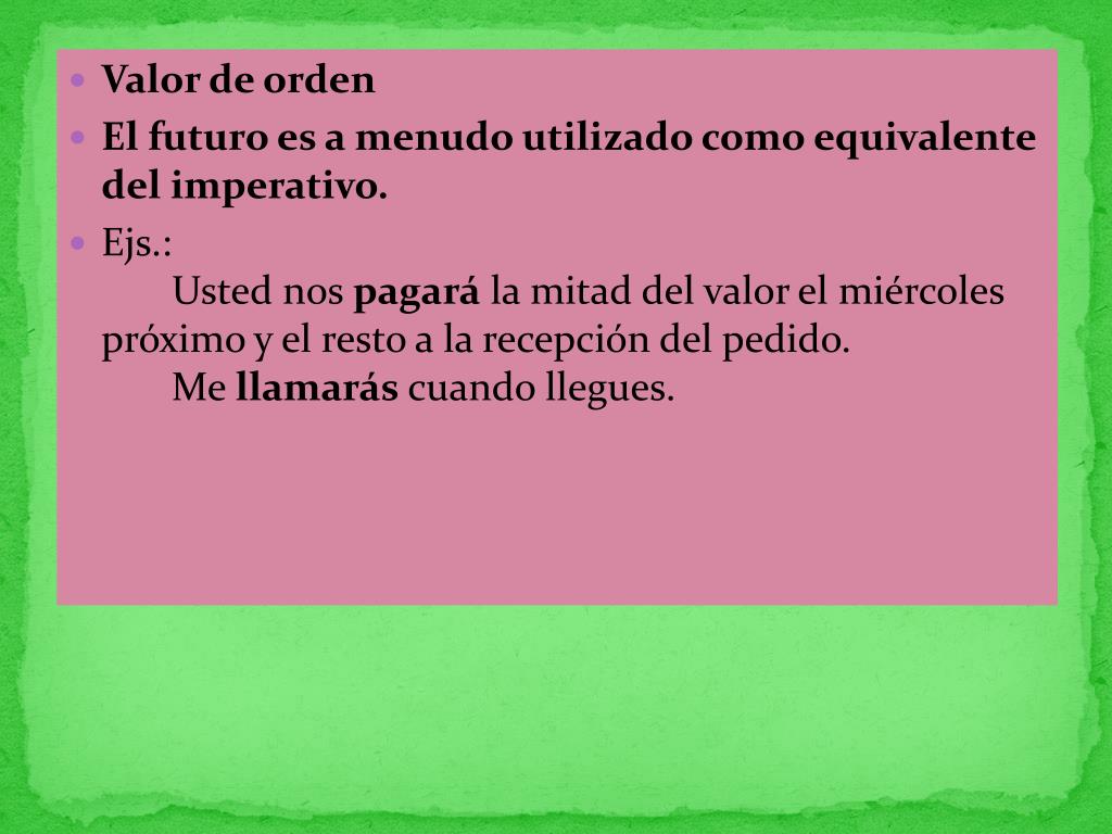 Valor de orden • El futuro es a menudo utilizado como equivalente del imperativo. • Ejs.: Usted nos pagará la mitad del valor el miércoles próximo y el resto a la recepción del pedido. Me llamarás cuando llegues.