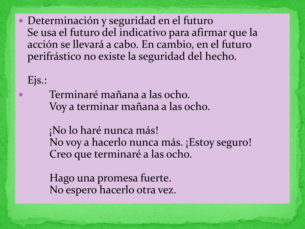 Determinación y seguridad en el futuroSe usa el futuro del indicativo para afirmar que la acción se llevará a cabo. En cambio, en el futuro perifrástico no existe la seguridad del hecho. Ejs.: • Terminaré mañana a las ocho. Voy a terminar mañana a las ocho. ¡No lo haré nunca más! No voy a hacerlo nunca más. ¡Estoy seguro! Creo que terminaré a las ocho. Hago una promesa fuerte. No espero hacerlo otra vez.