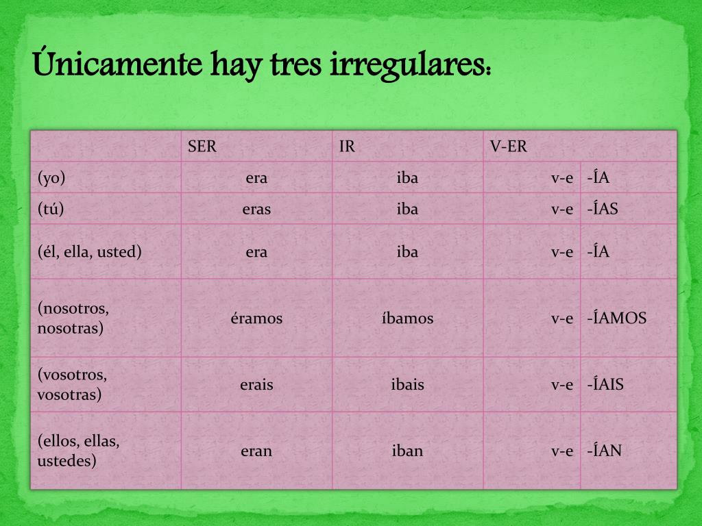 La crónica. LOS VERBOS EN LA CRÓNICA . PARA PRESENTAR LAS DESCRIPCIONES Y LAS ACCIONES CONTINUAS. PRÉTERITO IMPERFECTO. Construcción Es probablemente el tiempo más regular que existe. Ú nicamente hay tres ir regulares:. Uso El imperfecto tiene dos valores básicos: