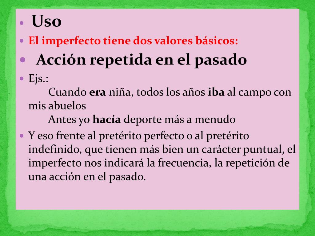 Uso • El imperfecto tiene dos valores básicos: • Acción repetida en el pasado • Ejs.: Cuando era niña, todos los años iba al campo con mis abuelos Antes yo hacía deporte más a menudo • Y eso frente al pretérito perfecto o al pretérito indefinido, que tienen más bien un carácter puntual, el imperfecto nos indicará la frecuencia, la repetición de una acción en el pasado.