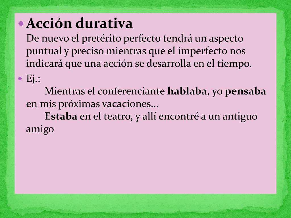 Acción durativaDe nuevo el pretérito perfecto tendrá un aspecto puntual y preciso mientras que el imperfecto nos indicará que una acción se desarrolla en el tiempo. • Ej.: Mientras el conferenciante hablaba, yo pensaba en mis próximas vacaciones... Estaba en el teatro, y allí encontré a un antiguo amigo