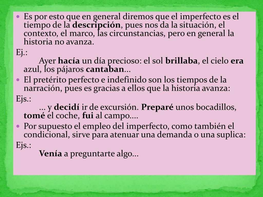 Es por esto que en general diremos que el imperfecto es el tiempo de la descripción, pues nos da la situación, el contexto, el marco, las circunstancias, pero en general la historia no avanza. Ej.: Ayer hacía un día precioso: el sol brillaba, el cielo era azul, los pájaros cantaban... • El pretérito perfecto e indefinido son los tiempos de la narración, pues es gracias a ellos que la historia avanza: Ejs.: ... y decidí ir de excursión. Preparé unos bocadillos, tomé el coche, fui al campo.... • Por supuesto el empleo del imperfecto, como también el condicional, sirve para atenuar una demanda o una suplica: Ejs.: Venía a preguntarte algo...