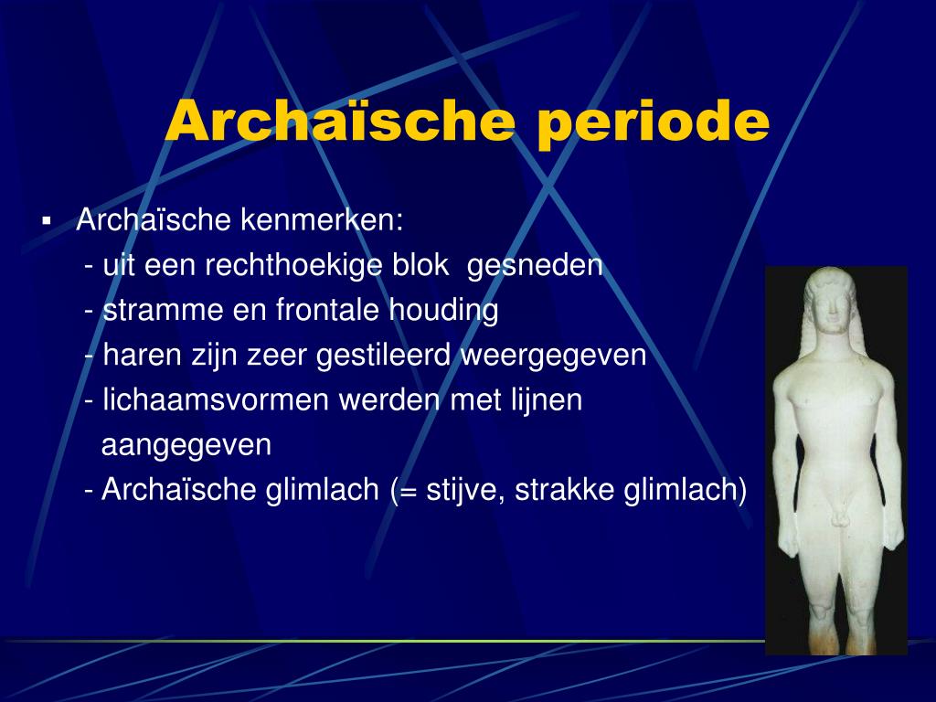 Archaïsche periode • Archaïsche kenmerken: - uit een rechthoekige blok gesneden - stramme en frontale houding - haren zijn zeer gestileerd weergegeven - lichaamsvormen werden met lijnen aangegeven - Archaïsche glimlach (= stijve, strakke glimlach)