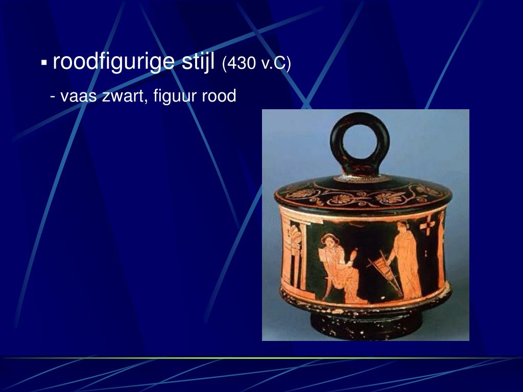 Twee stijlen: zwartfigurige en roodfigurige stijl. • zwartfigurige stijl (550 v.C.) - vaas rood, figuur zwart