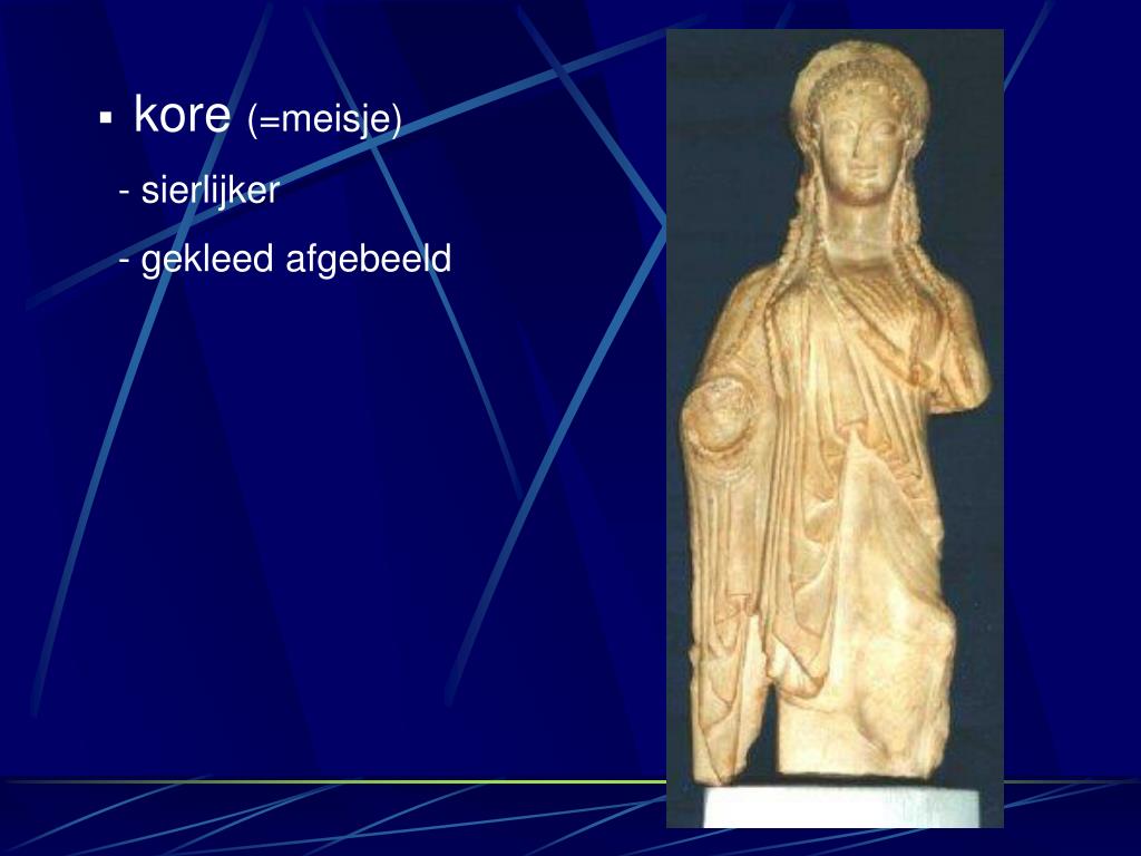 Kouros en kore • dienen als wijgeschenk of gedenkteken bij een graf • kouros (=jongen) - naakt afgebeeld