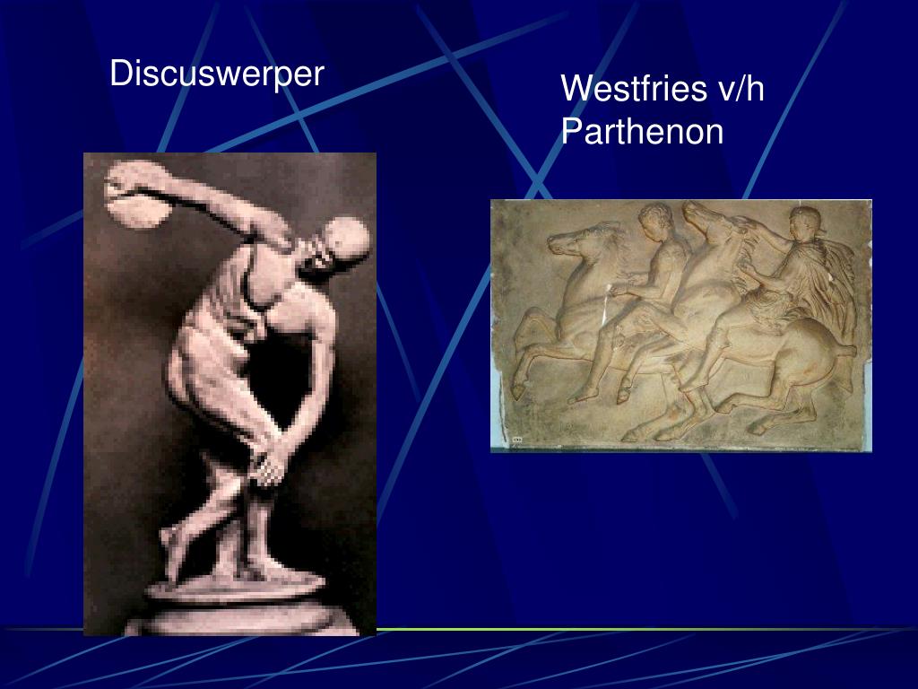 Klassieke periode • Klassieke kenmerken: - beheerste beweging - harmonie tussen spanning en ontspanning - perfecte anatomische weergave - lichte draaiing v/d heup doordat een knie lichgebogen is - natuurlijke glimlach