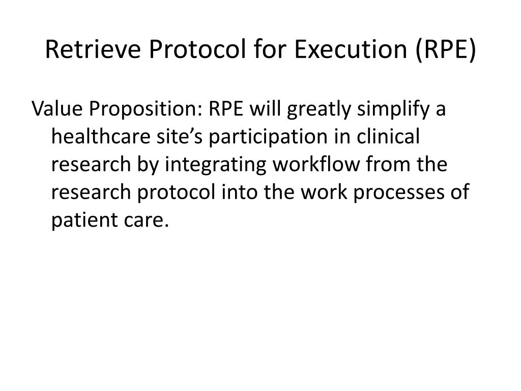 Retrieve Protocol for Execution (RPE). Value Proposition: RPE will greatly simplify a healthcare site’s participation in clinical research by integrating workflow from the research protocol into the work processes of patient care. Retrieve Protocol for Execution (RPE).