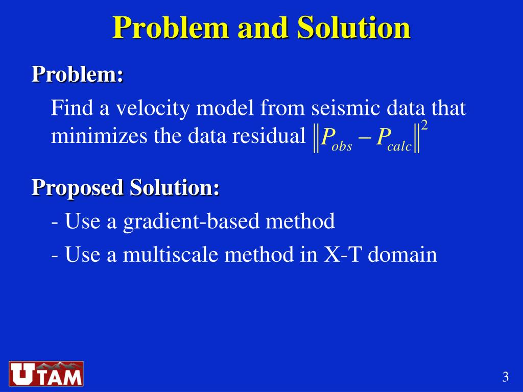 Problem and Solution Problem: Find a velocity model from seismic data that minimizes the data residual Proposed Solution: - Use a gradient-based method - Use a multiscale method in X-T domain 3