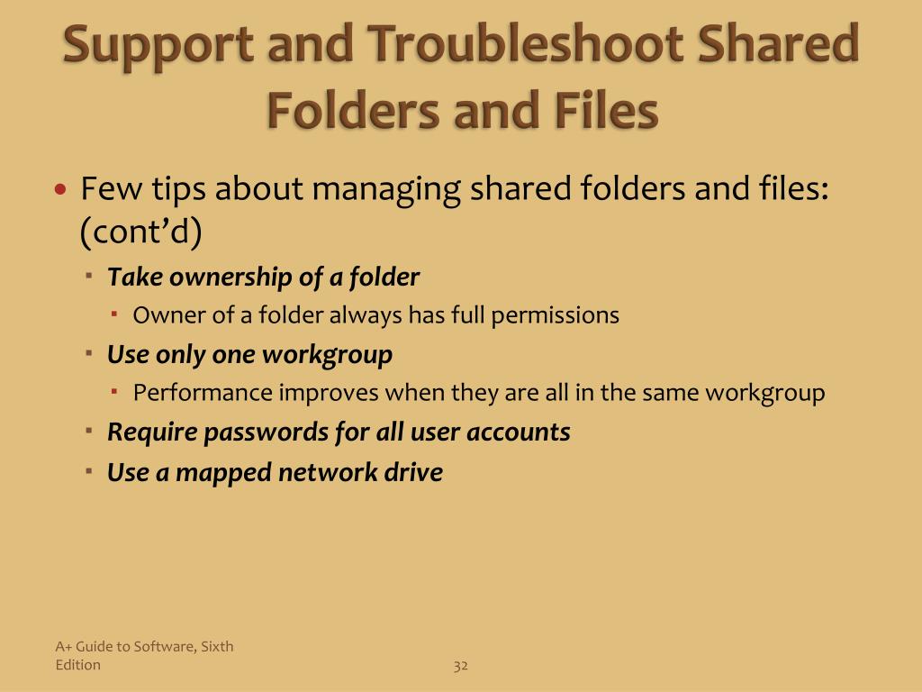Support and Troubleshoot Shared Folders and Files • Few tips about managing shared folders and files: (cont’d) • Take ownership of a folder • Owner of a folder always has full permissions • Use only one workgroup • Performance improves when they are all in the same workgroup • Require passwords for all user accounts • Use a mapped network drive A+ Guide to Software, Sixth Edition