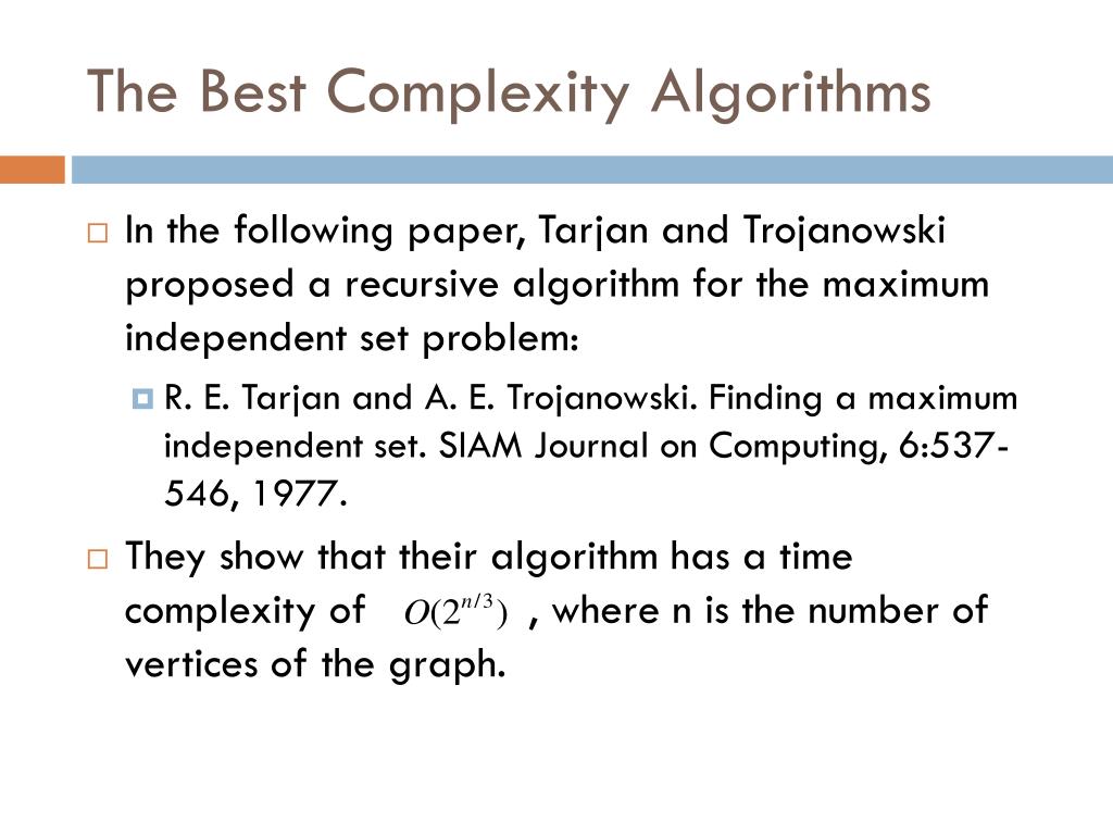 The Best Complexity Algorithms • In the following paper, Tarjan and Trojanowski proposed a recursive algorithm for the maximum independent set problem: • R. E. Tarjan and A. E. Trojanowski. Finding a maximum independent set. SIAM Journal on Computing, 6:537-546, 1977. • They show that their algorithm has a time complexity of , where n is the number of vertices of the graph.