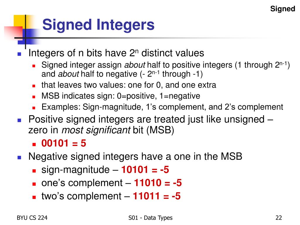 S01 - Data Types Required: PM: Ch 3, pgs27-35 PM: Ch 5 Code: Chs 1-9, 20Recommended: Wiki: Signed NumbersTwo's ComplementWiki: Two's_complementWiki: Fixed PointFloating Point