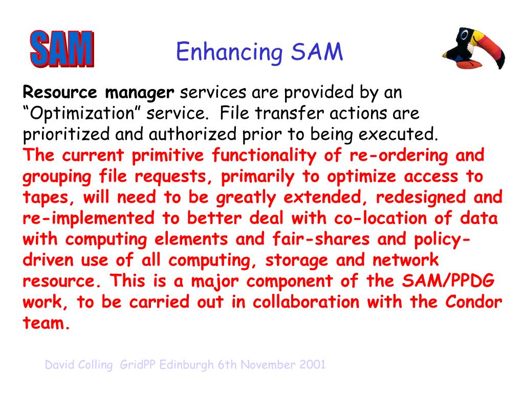 Enhancing SAM Resource manager services are provided by an “Optimization” service. File transfer actions are prioritized and authorized prior to being executed. The current primitive functionality of re-ordering and grouping file requests, primarily to optimize access to tapes, will need to be greatly extended, redesigned and re-implemented to better deal with co-location of data with computing elements and fair-shares and policy-driven use of all computing, storage and network resource. This is a major component of the SAM/PPDG work, to be carried out in collaboration with the Condor team.