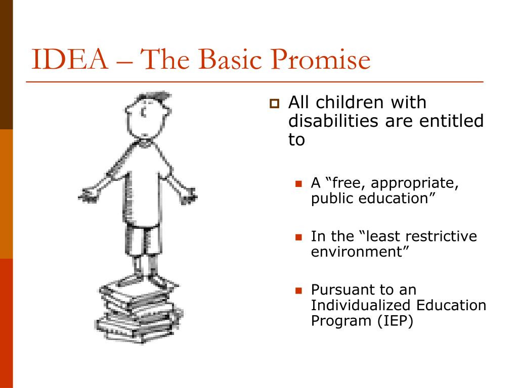 IDEA – The Basic Promise • All children with disabilities are entitled to • A “free, appropriate, public education” • In the “least restrictive environment” • Pursuant to an Individualized Education Program (IEP)