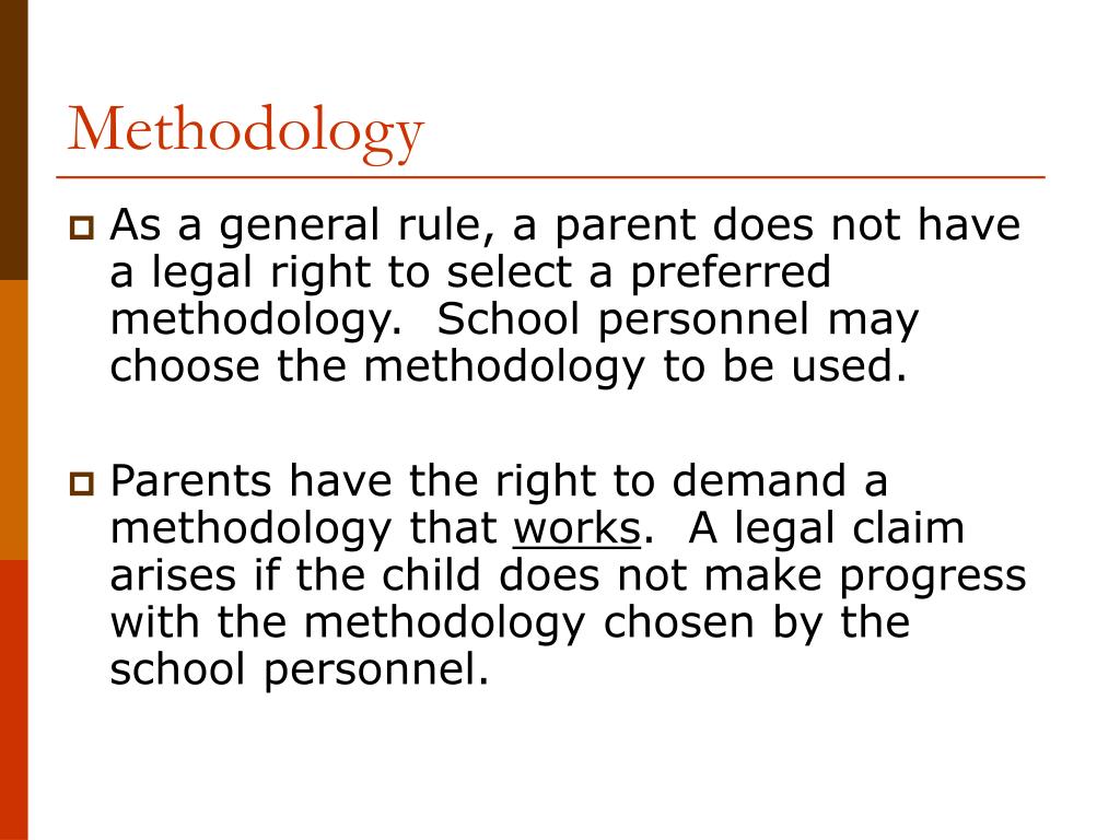 Methodology • As a general rule, a parent does not have a legal right to select a preferred methodology. School personnel may choose the methodology to be used. • Parents have the right to demand a methodology that works. A legal claim arises if the child does not make progress with the methodology chosen by the school personnel.