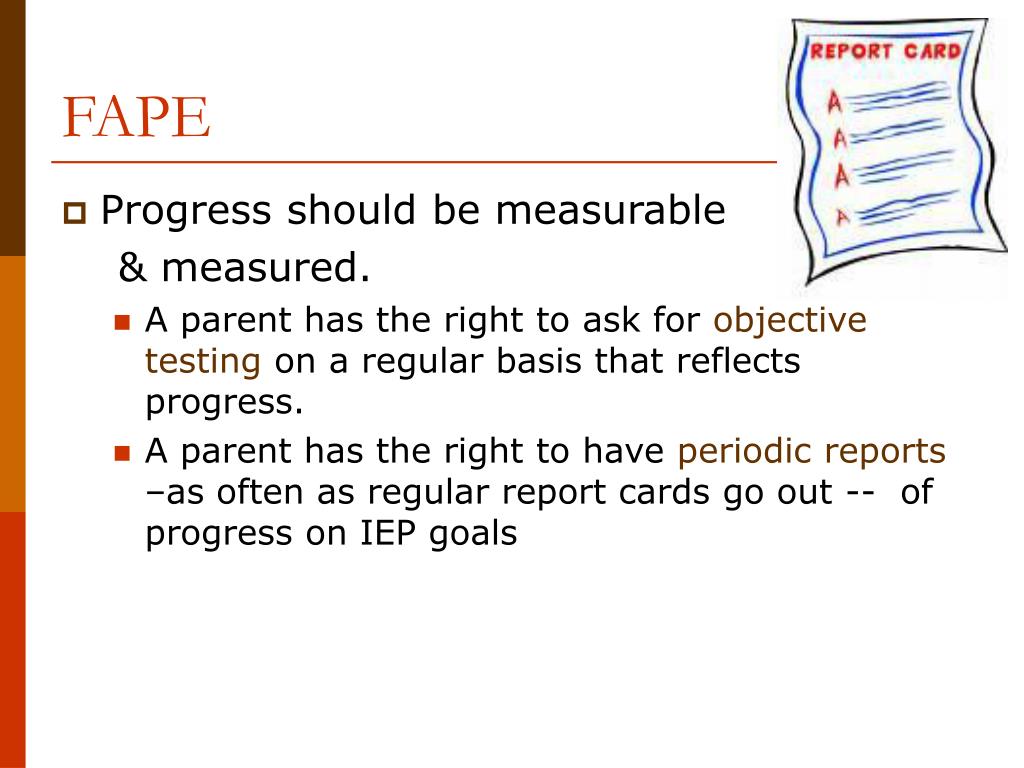 FAPE • Progress should be measurable & measured. • A parent has the right to ask for objective testing on a regular basis that reflects progress. • A parent has the right to have periodicreports –as often as regular report cards go out -- of progress on IEP goals