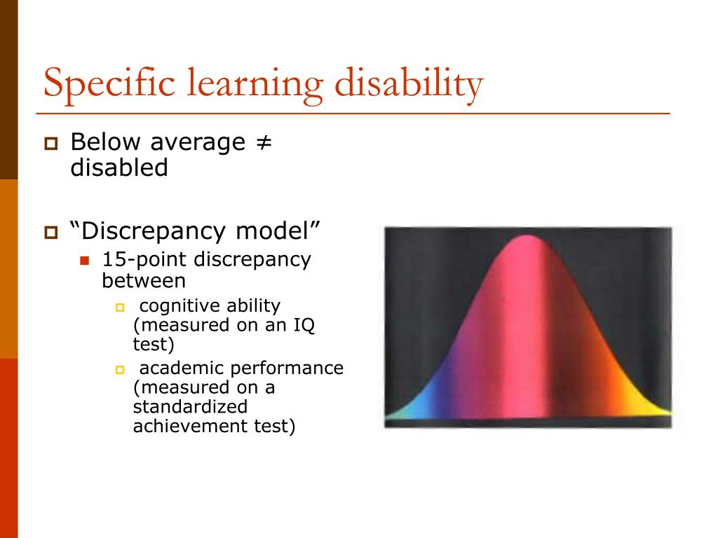 Specific learning disability • Below average ≠ disabled • “Discrepancy model” • 15-point discrepancy between • cognitive ability (measured on an IQ test) • academic performance (measured on a standardized achievement test)