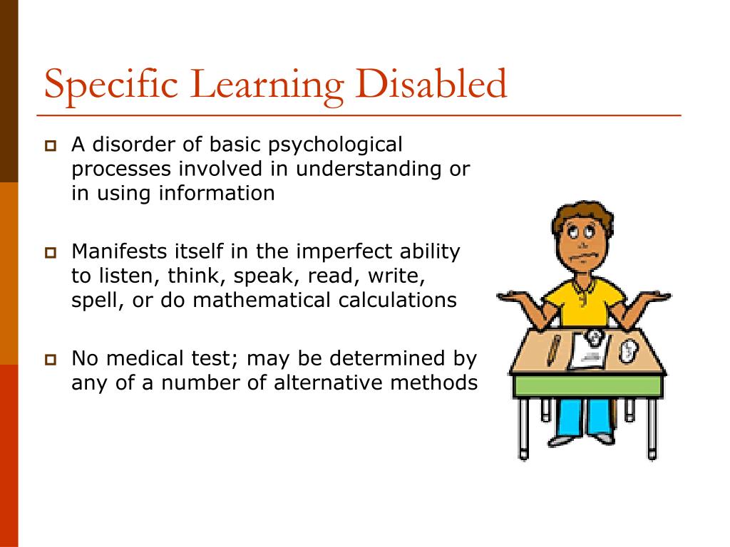 Specific Learning Disabled • A disorder of basic psychological processes involved in understanding or in using information • Manifests itself in the imperfect ability to listen, think, speak, read, write, spell, or do mathematical calculations • No medical test; may be determined by any of a number of alternative methods