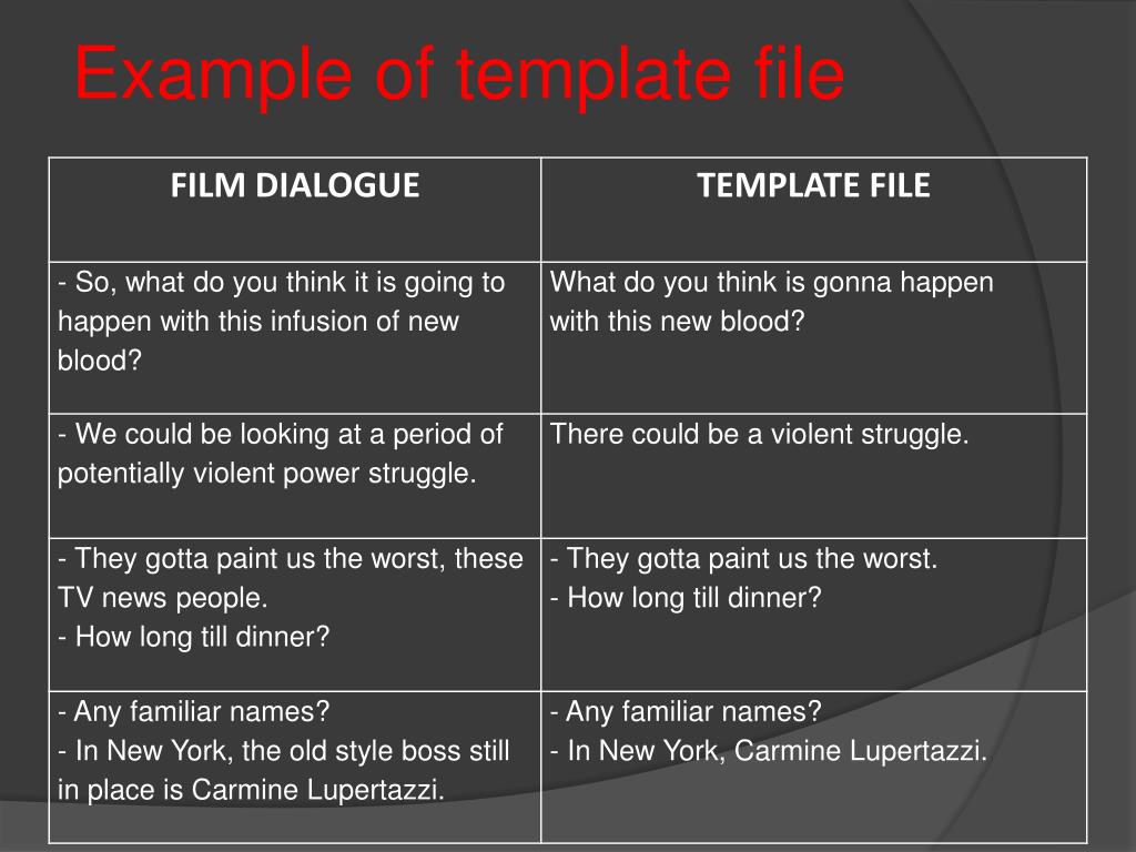 Suggestions • Template files should contain the full transcribed dialogue and on-screen text. • Template files should provide broader background information and guidance.